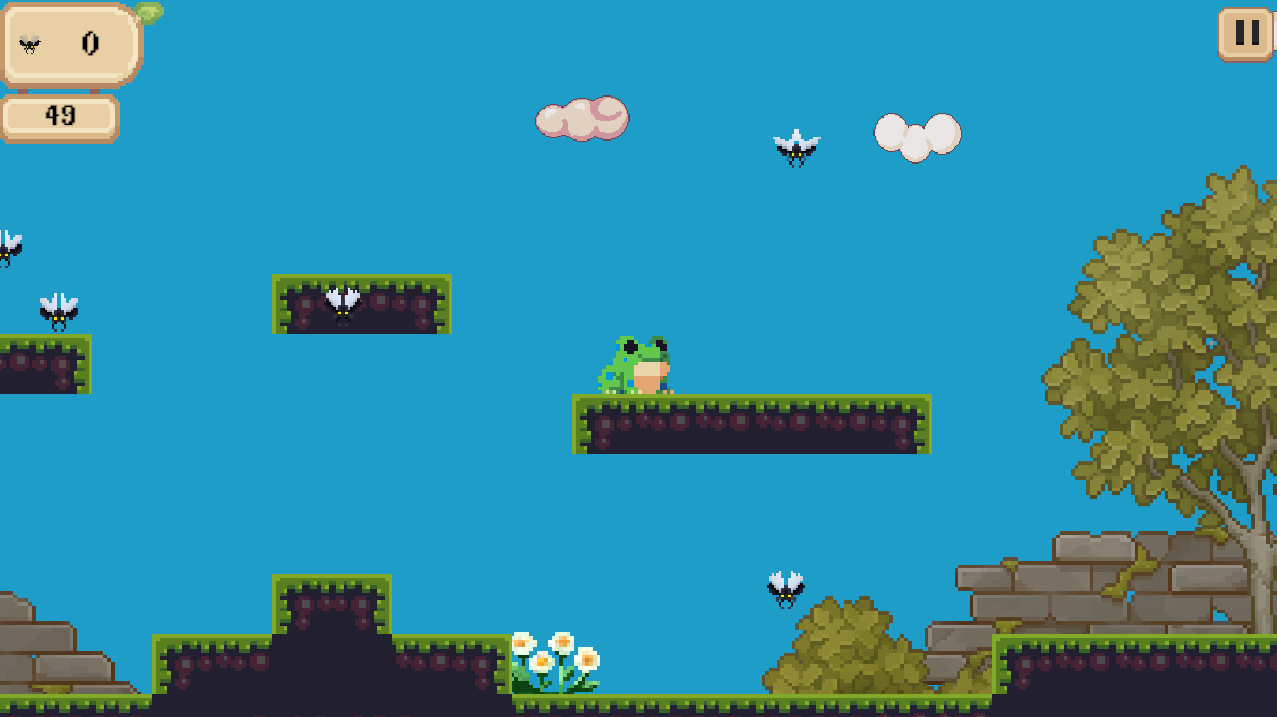 The game is about a little frog that must catch as many flies as possible before time runs out. As the timer gets shorter, he needs to collect stars that appear on the map to increase his time and catch more flies. The main mechanic is jumping between platforms to reach the flies and the stars. The game has only one main level with a fixed map where the frog can freely move and jump between platforms.